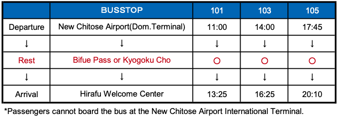 Direct bus service between the airport and Hirafu Welcome Center. Travel time is approximately 2.5–3 hours.