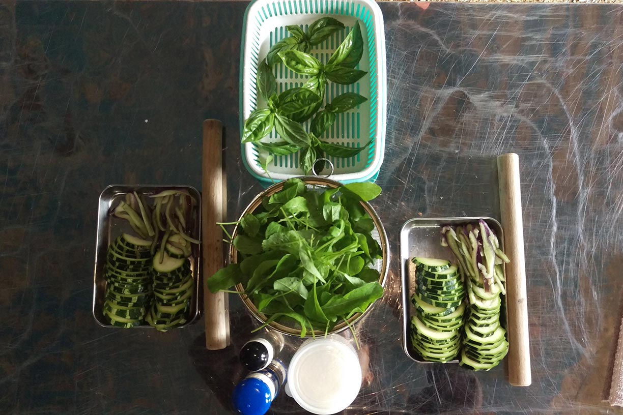 Due to the heavy rains today, the farm very kindly harvested the vegetables for us. There were zucchinis, potatoes, basil, rucola, purple capsicums. This was the first time we had ever seen purple capsicums, they were very sweet.